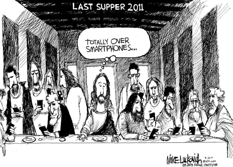 Image Posted by Lior Frenkel Posted on July 28, 2013 Posted under Uncategorized Comments Leave a comment Mike Luckovich: “Totally Over Smartphones” Mike Luckovich: “Totally Over Smartphones” Share this: Click to email a link to a friend (Opens in new window) Email Click to share on X (Opens in new window) X Click to share on Facebook (Opens in new window) Facebook Click to share on LinkedIn (Opens in new window) LinkedIn Like Loading... Related dinner smartphoneeating with smartphonejesus smartphoneslast supperMike Luckovichsmartphone addictionsmartphones around tableTotally Over Smartphones Post navigation ← Andy Bailey: Cellphone can be more a distraction than a tool What do you do when your battery runs out? → Leave a comment Cancel reply Δ